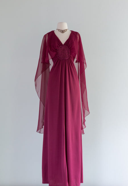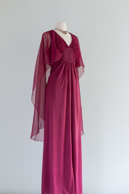 Fabulous 1970's Beaujolais Evening Gown With Chiffon Capelet / Large