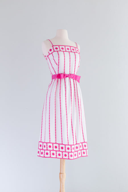 Fabulous 1970's Candy Striped Embroidered Cotton Dress By Victor Costa / XS