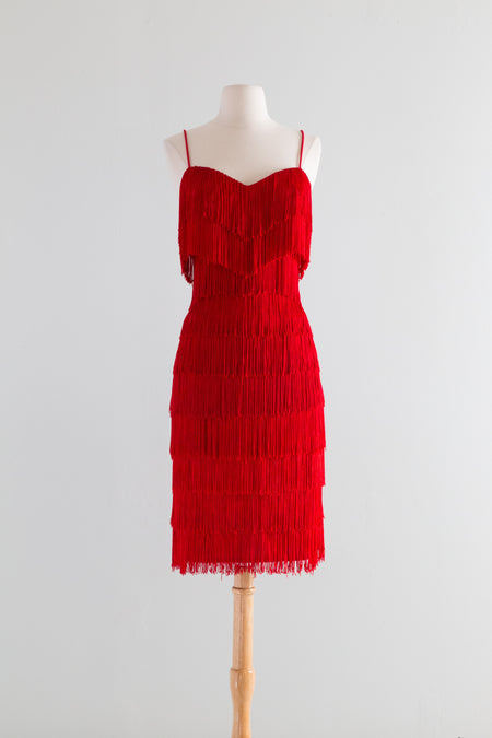 Fabulous 1970's Cherry Red Fringe Flapper Style Dress / Med