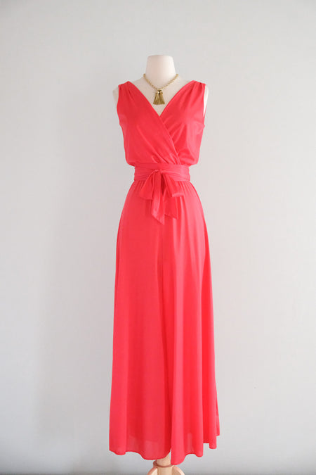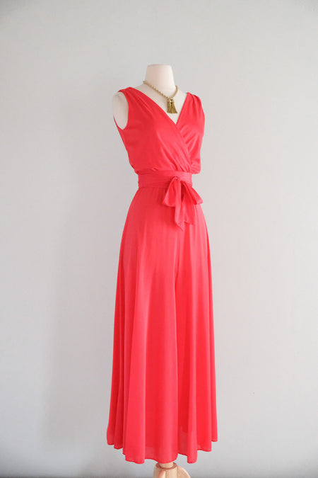 Fabulous 1970's Watermelon Red Jersey Palazzo Pant Jumpsuit / M