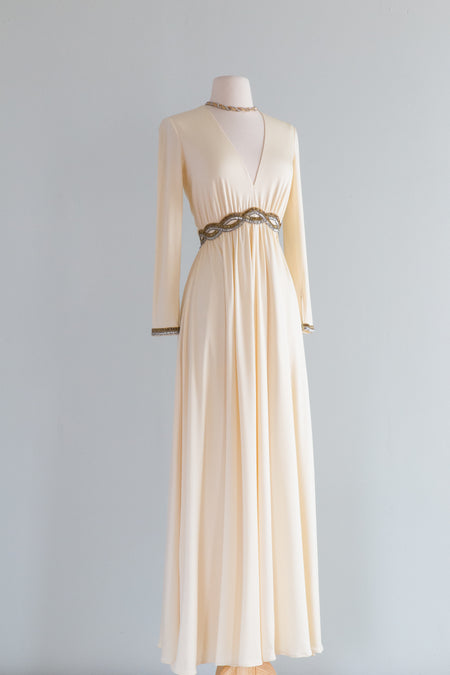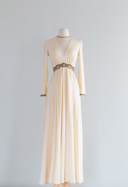 Glamorous 1970s Ivory Goddess Gown With Beading / Small