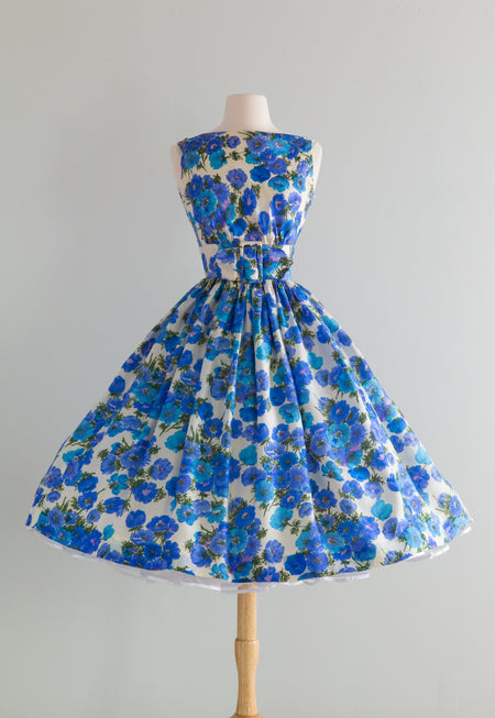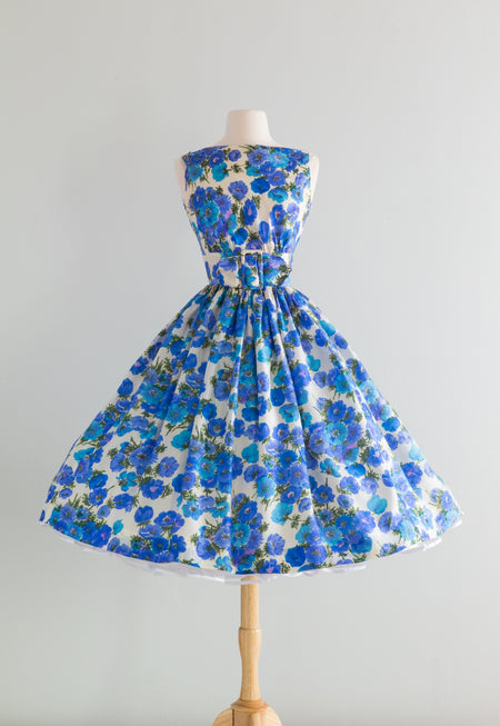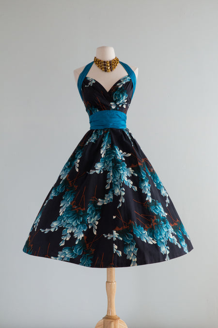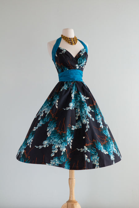 Sold Out Gorgeous 1950's Midnight Garden Floral Cocktail Dress With Rhinestones and Suspended Sleeves / Med. $298.00