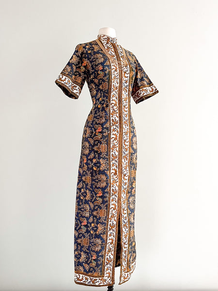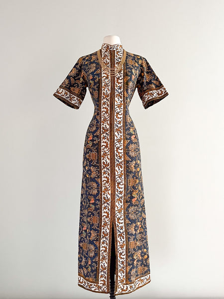 Gorgeous 1970's Navy & Gold Batik Kaftan Dress / Sz M