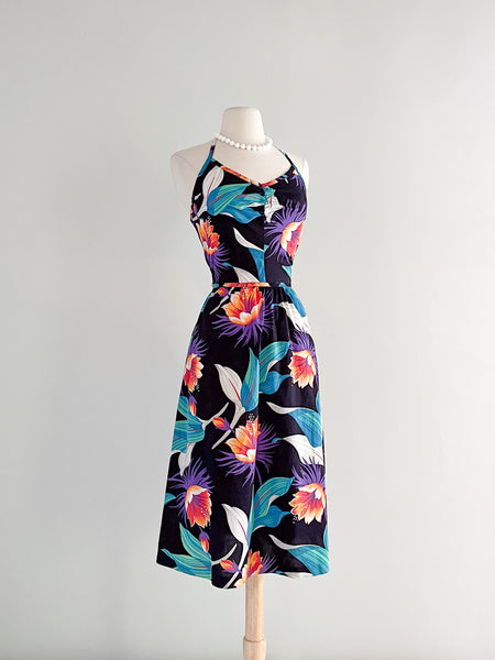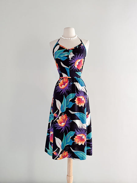 Late 1970's Exotic Midnight Floral Halter Dress / Sz M