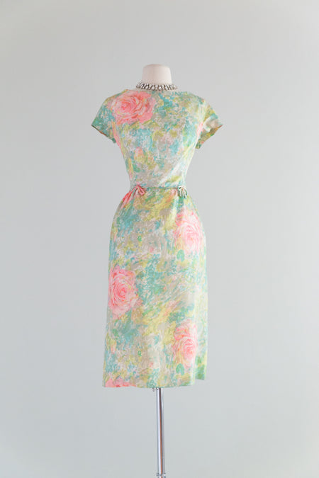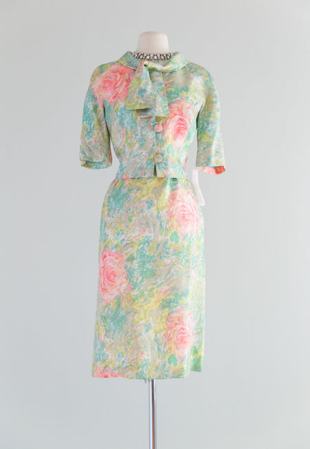Late 1950's Pink Rose Print Silk Dress & Jacket By Abe Schrader / Waist 30"