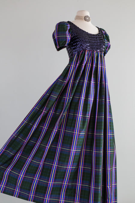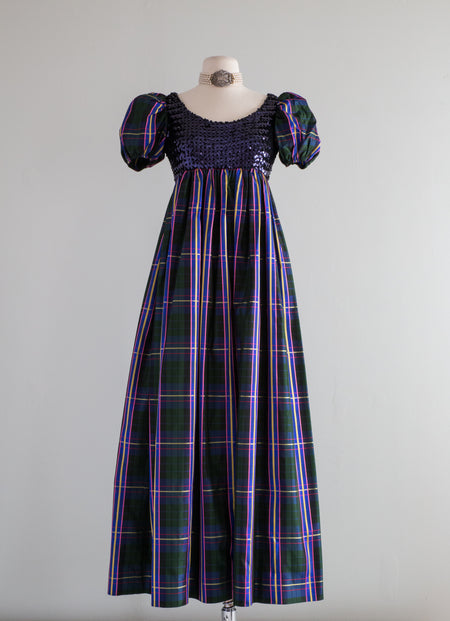 Late 1960's Plaid Taffeta Empire Waist Evening Gown With Pockets / Medium