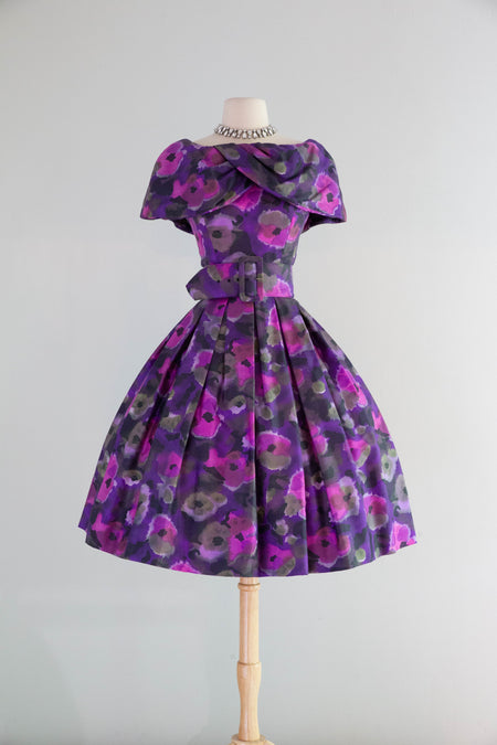 Sophisticated 1950's Violet Silk Floral Print Party Dress By Gigi Young / Small