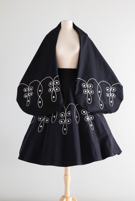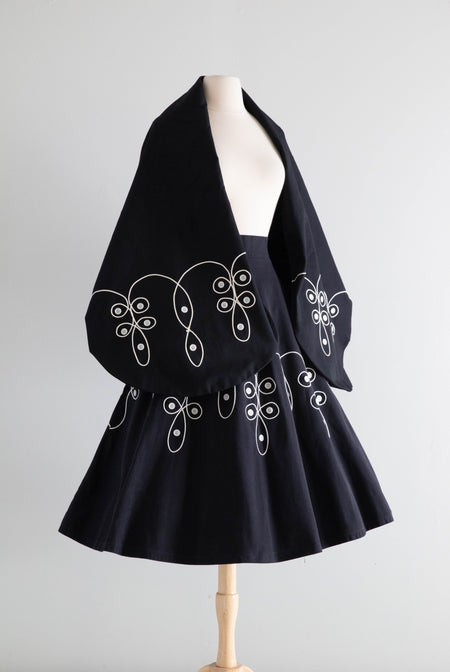 Sold Out Spectacular 1950's Black Cotton Embroidered Skirt and Matching Shawl With Massive Hidden Pockets / Small $225.00