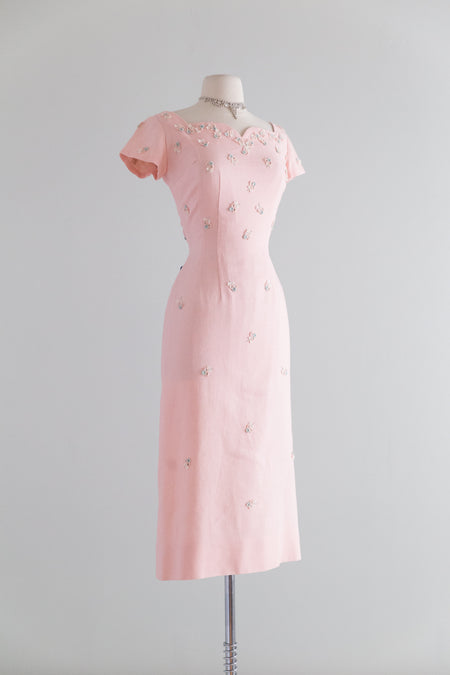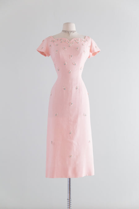 Stunning 1950's Pink Linen Cocktail Dress From Razooks / Waist 28"
