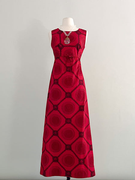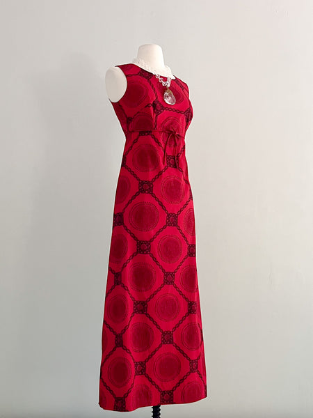 Stunning 1960's Crimson Goddess Printed Maxi Dress / Sz SM