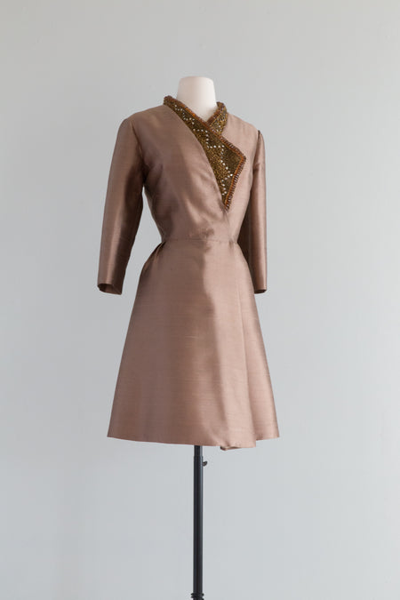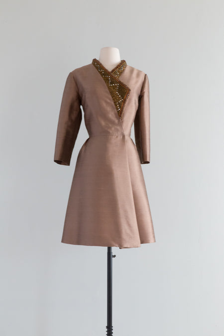 Stunning 1960's Crystal Beaded Evening Gown In Caramel Silk / SM