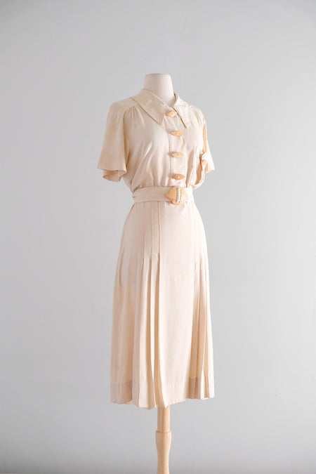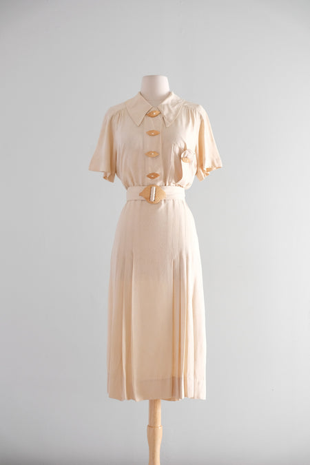 Vintage 1930's Pongee Silk Ivory Dress With Carved Coconut Leaf Buttons / M