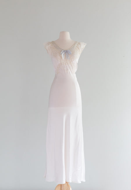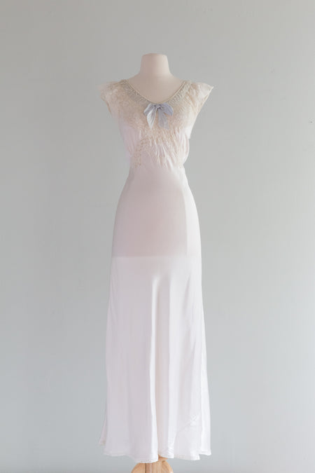 Vintage 1930's Ivory Satin Bias Cut Gown With Blue Bow / Medium