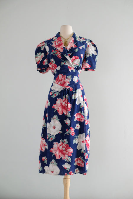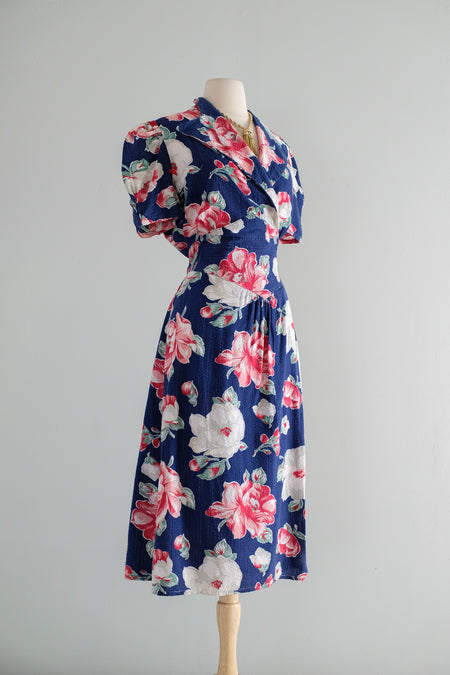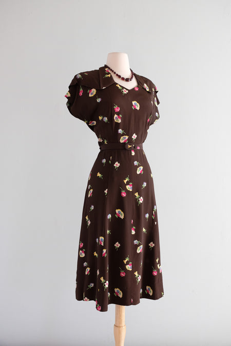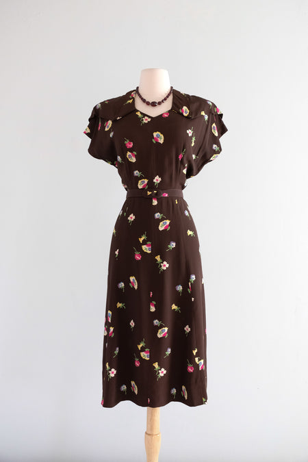 Vintage 1940's Chocolate Spring Floral Rayon Day Dress / M