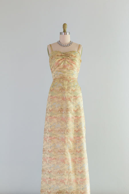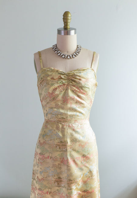 Vintage 1940's Golden Chinese Silk Brocade Evening Gown / Small