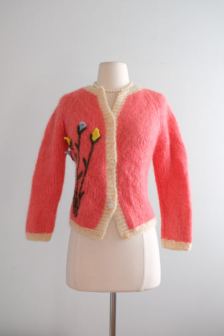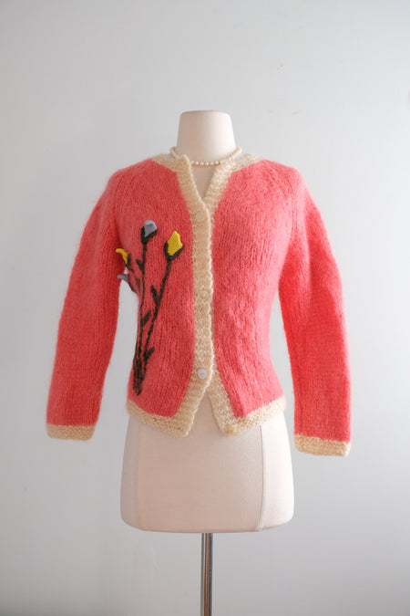 Vintage 1950's Strawberry Pink Mohair Knit Cardigan by Dalton / S