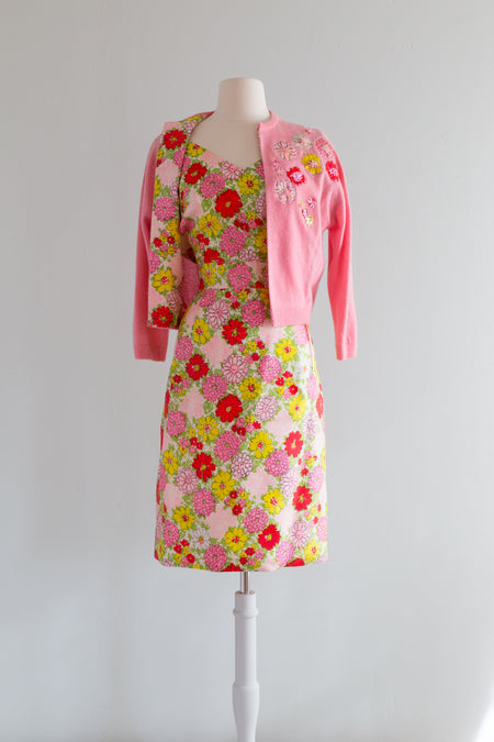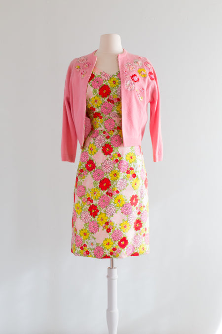 Vintage 1950's Spring Delight Silk Dress With Matching Cashmere Cardigan / Waist 27