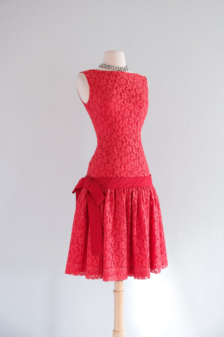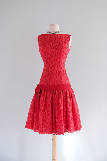 Vintage 1950's 🍒 Red Lace Party Dress by Ro-Nel / S
