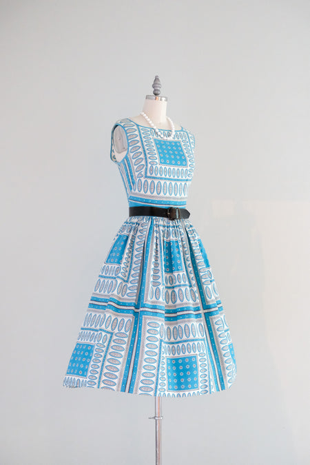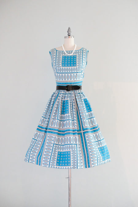 Vintage 1950's Turquoise Blue Bandana Print Cotton Dress by Happy Home / Small