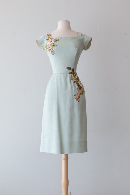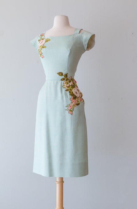 Vintage 1950s Peggy Hunt Aqua Linen Cocktail Dress With Rose Applique Pocket / SM