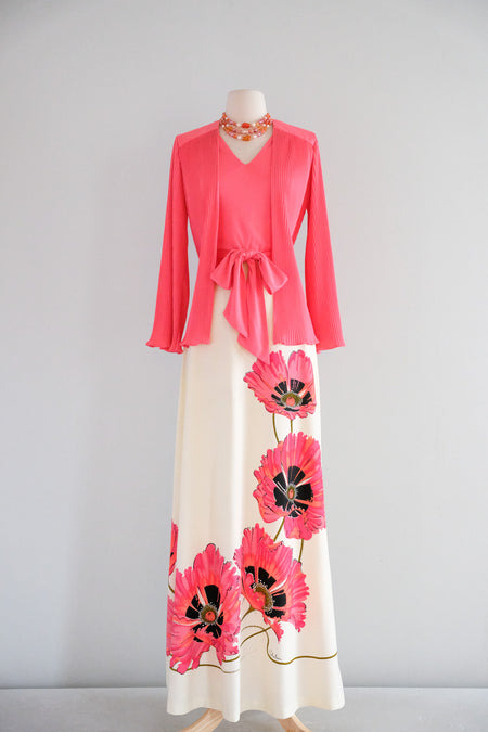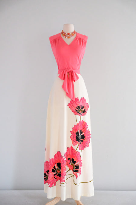 Vintage 1970's Pink POPPY Print Jersey Gown By Alfred Shaheen / Medium