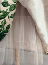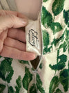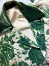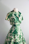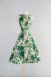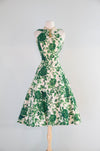 Make a breathtaking entrance in this exquisite 1950's Estevez party dress showcasing a vibrant emerald rose print on polished cotton. The alluring combination of a sexy neckline and dramatic open back creates irresistible mid-century allure, while the dropped waist and flared skirt deliver the quintessential 50's silhouette. Complete with a matching jacket featuring an elegant velvet collar, this fully lined designer masterpiece with authentic metal back zipper embodies timeless glamour that modern reproductions simply cannot match. An investment piece that will turn heads for decades to come!