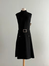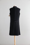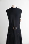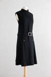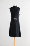 This fabulous 1960's Teal Traina (designed by Geoffrey Beene) dress epitomizes the sleek, modern lines of 1960's American fashion. Crafted from finely woven black wool, the sleeveless sheath silhouette features a high, softly structured funnel neckline and a dropped waist cinched by a matching belt with a rhinestone-encrusted buckle. Rhinestone button details at the hips add a subtle sparkle, balancing sophistication with understated glamour.
