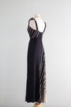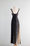 Though this example is missing its label, the artistry of its construction, the impeccable bias drape, and the distinctive placement of the diagonal striping unmistakably recall the work of Madame Grès. The gown’s bodice features delicately twisted shoulder straps and a softly pleated neckline that sculpt and frame the torso. The asymmetrical panel of ivory silk striped in black creates a mesmerizing play of light and movement, visually echoing the dramatic chiaroscuro captured in Hoyningen-Huene’s studio portrait. Every seam is precisely couture stitched by hand. The skirt wraps seamlessly around the hips and secures at the waist with snaps and hook and eyes.