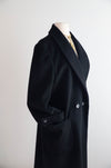 The coat features a softly structured silhouette with a wide shawl collar, double-breasted front closure, and deep patch pockets that lend both functionality and visual balance. The turned-up cuffs with button tabs add a subtle tailored touch, while the generous length elongates the figure for a dramatic yet refined profile. The coat is fully lined for comfort and finished with thoughtful interior detailing indicative of fine mid-century American tailoring.