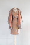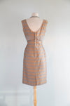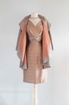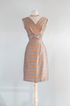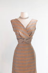 A chic and beautifully tailored 1950s dress and swing jacket ensemble, crafted in a warm caramel-and-taupe striped textile with a subtle metallic sheen. The sleeveless dress features a flattering surplice bodice, a cinched waist accented by a sculptural bow, and a sleek, elongating skirt. It zips up the back and is fully lined for a smooth, structured fit.
