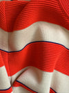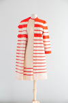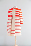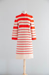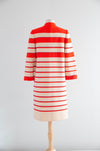 Absolutely fabulous two piece wool knit set by Cadillac. Hand fashioned in Italy of 100% virgin wool. Featuring a bold striped knit sweater coat in electric red, blue and ivory. A semi fitted short sleeve sheath dress completes the look. Zips up the back with original hand set zipper. In excellent condition, freshly dry cleaned and ready to wear.