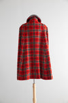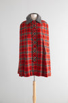 Fabulous 1960’s Pendleton Woolen Mills cape in a bold red tartan plaid. Expertly woven of 100% pure virgin wool in Portland, Oregon, this swingy silhouette captures Pendleton’s heritage of quality and craftsmanship dating back to 1863. Features include a dramatic button-front closure with plaid-matched detailing, a plush gray wool collar, full lining for a smooth drape, and Pendleton’s signature attention to finishing complete with hidden interior pockets! Timelessly chic and endlessly wearable, this cape is in excellent condition, freshly dry cleaned and ready to wear.