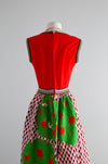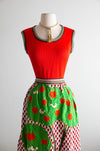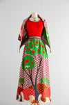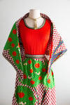 Absolutely fabulous early 1970's bold colorful maxi dress with matching shawl by Gene Stanley. Featuring a stretchy knit tank top above a marvelous scenic print skirt with birds and apple trees. I could just look at this thing for hours! Zips up the back with original zipper. Comes complete with matching shawl. In excellent condition, freshly cleaned and ready to wear.
