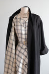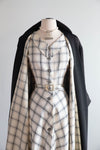 A chic early 1950s dress and matching swing coat set in a classic cream-and-black plaid. The dress features a softly scalloped V-neckline, decorative rhinestone faceted buttons, short sleeves, and a cinched belted waist that flows into a flattering mid-calf A-line skirt. A charming tie detail at the back neckline adds a subtle feminine touch.