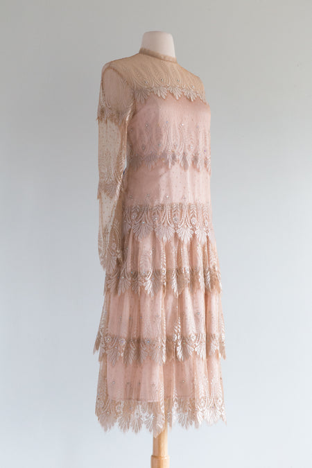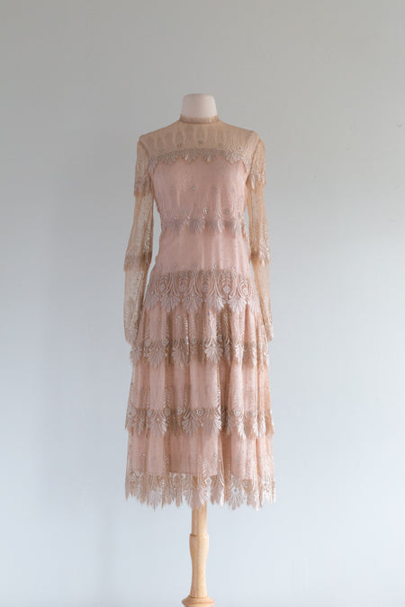 Ethereal 1970's Designer Rina di Montella Tiered Lace Evening Dress / SM