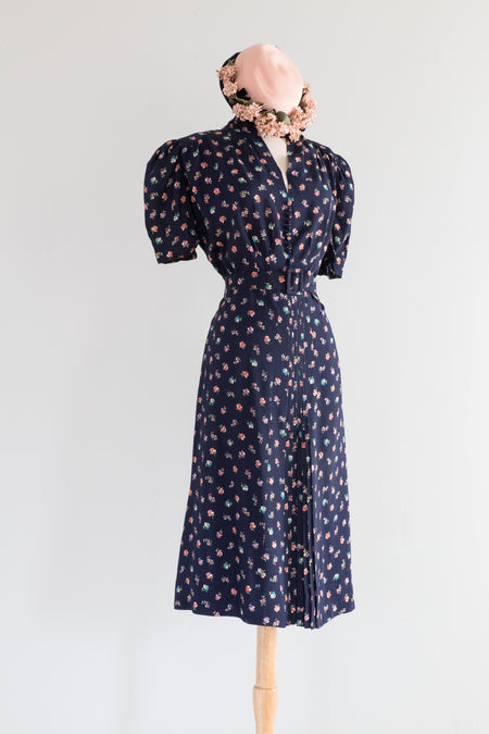 Beautiful 1940's Rayon Floral Print Day Dress With Matching Hat / ML