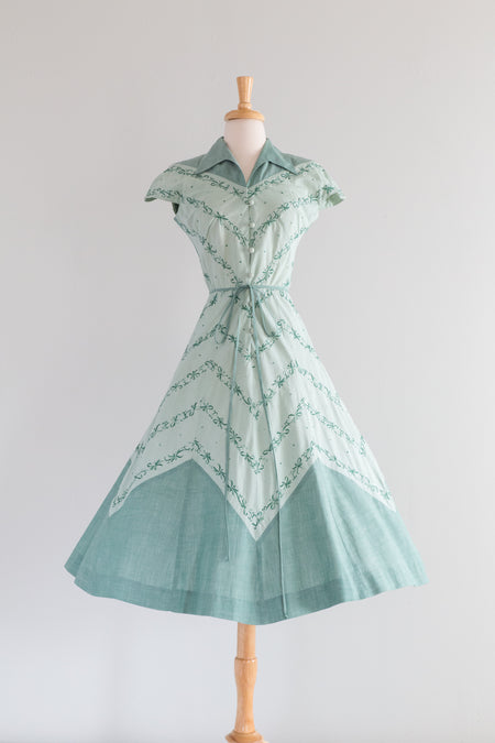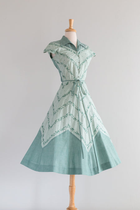Beautiful 1950's Doris Dodson Spearmint Embroidered Cotton Day Dress / Small