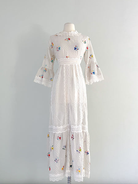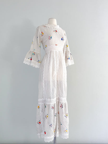 Darling 1970's Mexican wedding Dress in Ivory & Lace Embroidered Maxi Dress / Sz M