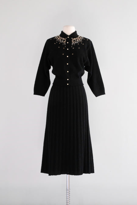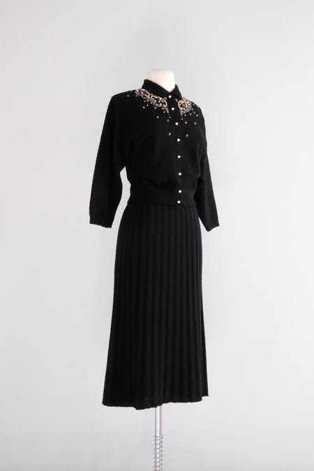 Marvelous 1940's Kims Black Wool Boucle Knit Sweater & Skirt Set / Sz M