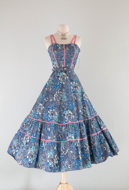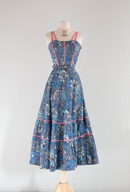 Beautiful Early 1950's Romantic Blue Floral Cotton Dress With Pink Accents / Small