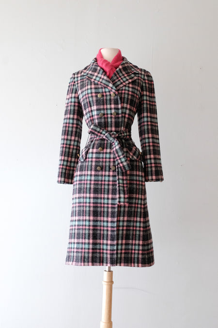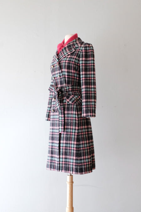 Adorable 1960's Pink & Teal Plaid Peacoat / Sz M