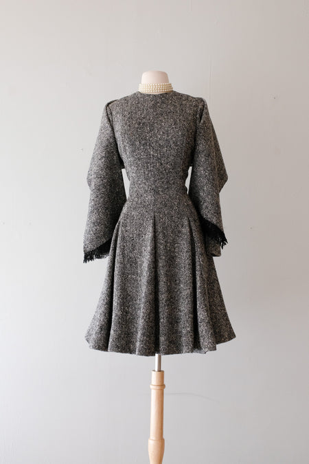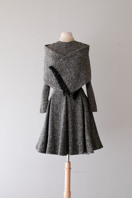 Sublime 1960's Teal Traina Black & White Speckled Wool Dress & Wrap / Sz M/L