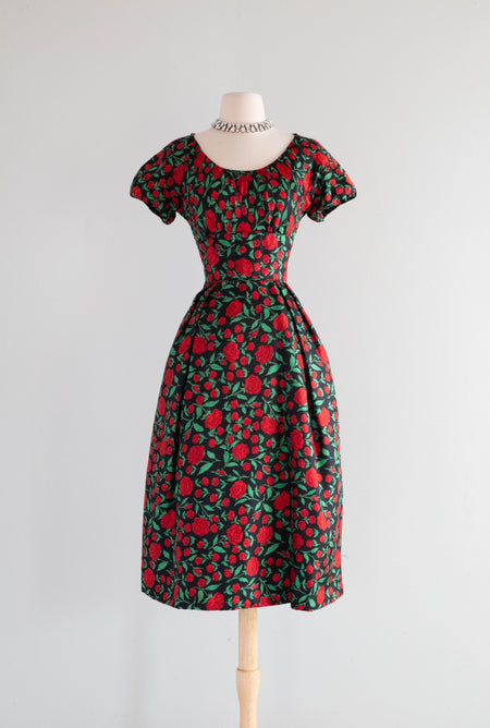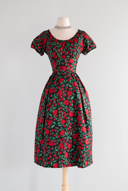 Classic Late 1950's I. Magnin Red Rose Print Silk Cocktail Dress / M