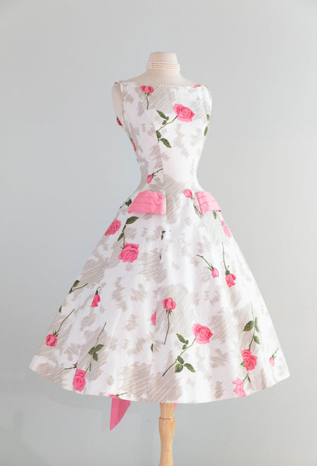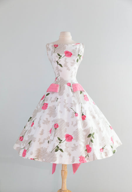 Gorgeous 1950's Polished Cotton Pink Rose Print Dress With Big Pink Bow! SM