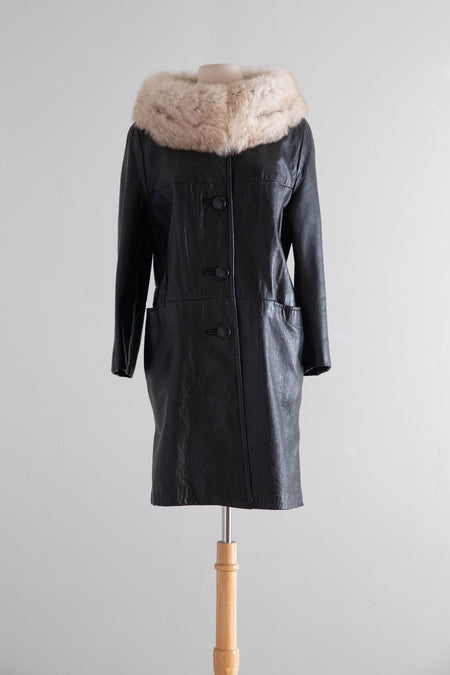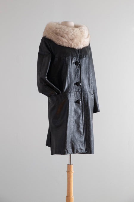 Fabulous 1960's Black Leather Coat With Fur Collar / ML