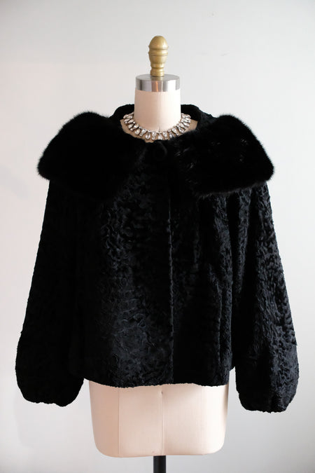 Vintage 1950's Black Persian Lamb & Mink Collar Fur Evening Jacket / S