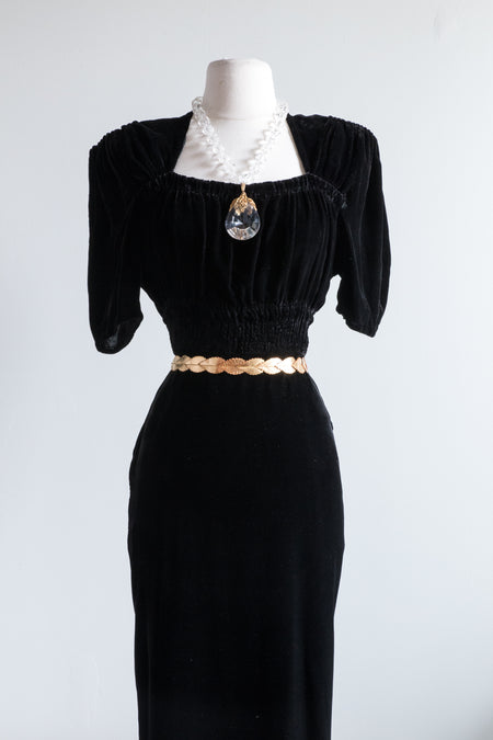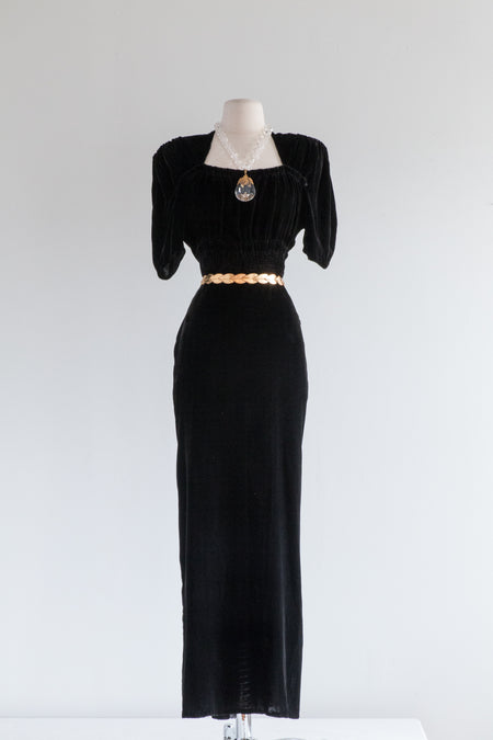 Dramatic 1930's Silk Velvet Evening Gown With Cartridge Sleeves / Waist 26"