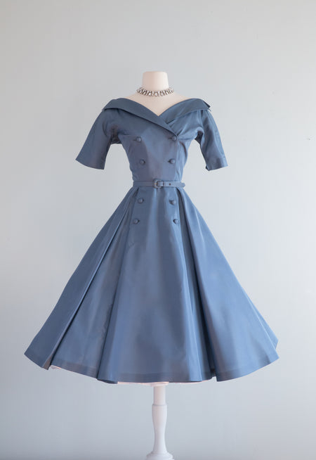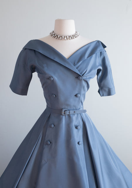 1950's French Blue Taffeta Cocktail Dress By Marjorie Montgomery / Waist 26