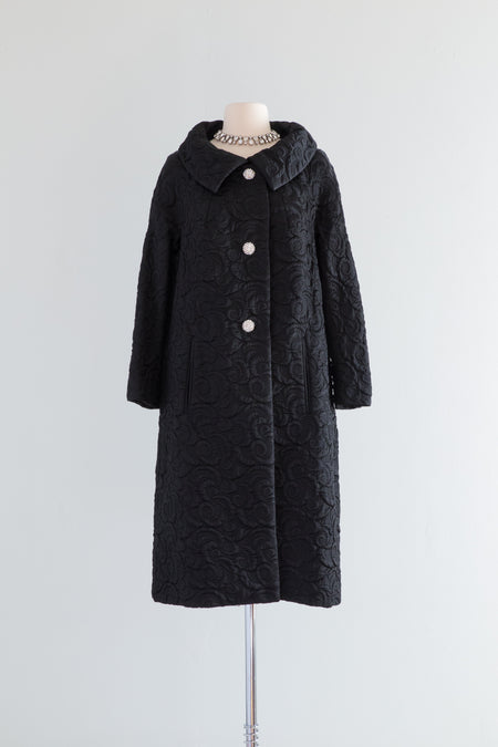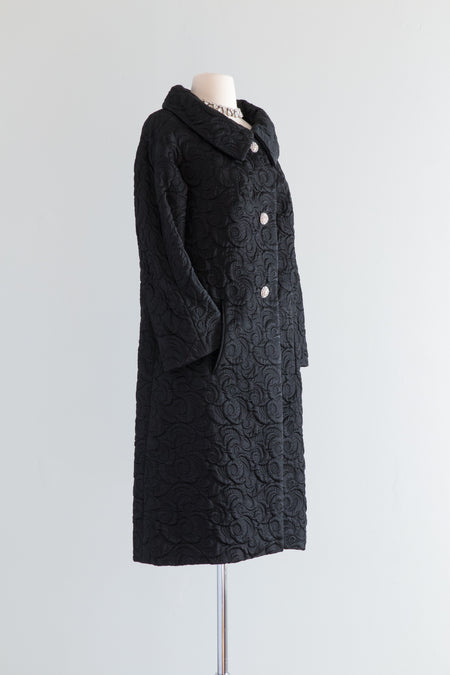 FABULOUS 1960's Black Brocade Evening Coat From Montaldos / Medium