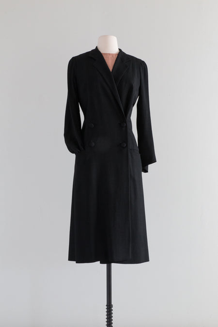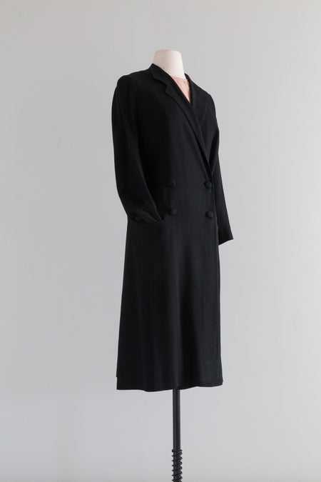 Elegant 1920's Black Crepe Longline Tuxedo Style Coat With Fur Wrap / Small